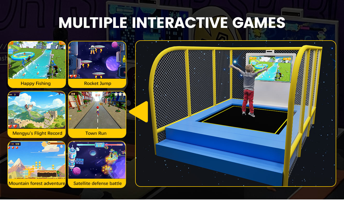 Our trampoline all-in-one machine is a large-scale interactive system that combines a display screen with a trampoline, perfectly integrating interactive technology with trampolines, endowing trampoline games with a sense of technology. Meanwhile, users can participate in role-playing and challenge levels, making it more challenging and stimulating their interest in sports. There are currently six interactive games that are very popular in the market.
